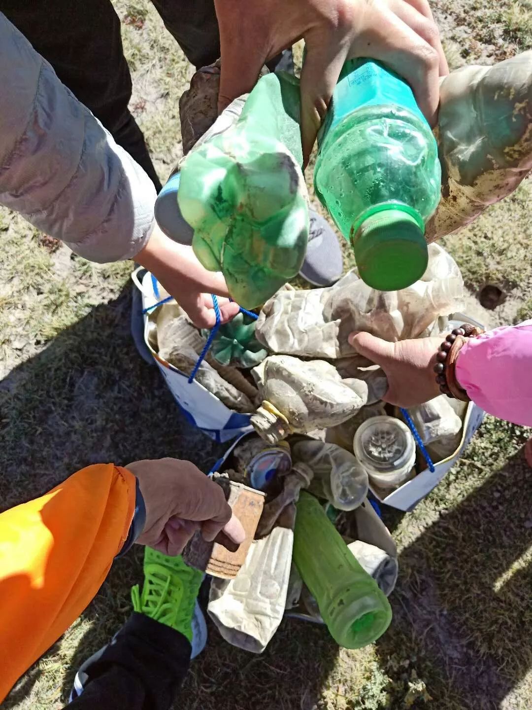 一些队员自发地捡拾垃圾,手里拿不下,就抱在怀里。高反灵工作人员看到了,打开车子,拿出高反灵包装纸袋发放。