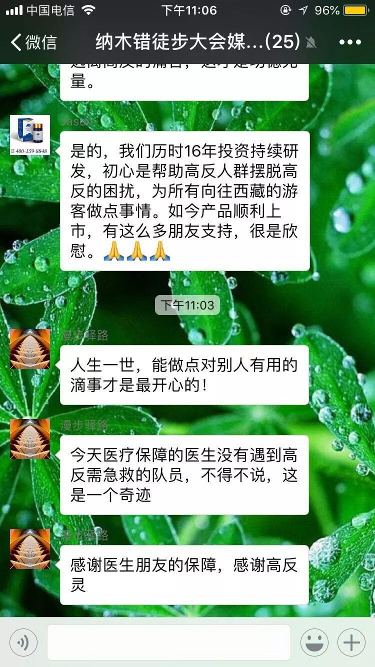 来自南京的徐先生,由于前一天晚上洗澡,感冒、头痛、高反不适,遗憾不能参加徒步。服用高反灵后第二天,专门在电话里感谢,说是身体已经恢复良好。